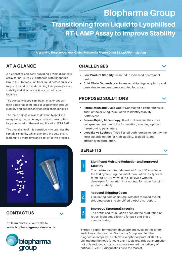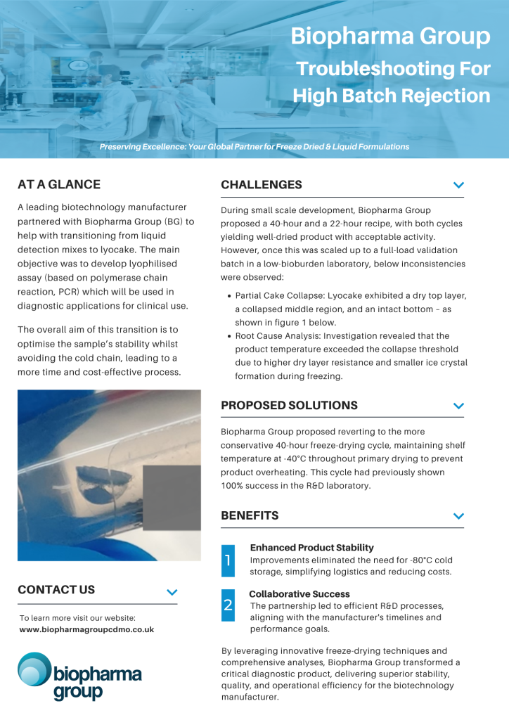From lyo cycle development to the latest technologies and industry developments or innovations, our articles and case studies act as scientifically accurate, informative resources for all queries related to CDMO processes. The team at Biopharma Group are keen to share the findings of our lyophilisation services and practical experience to contribute to industry-wide conversations.